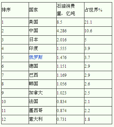 据BP公司2011世界能源统计评论,2010年石油消费量统计中,美国仍占首位,为8.5亿吨,比2009年8.429亿吨增加了710万吨;中国由2001年第3位上升至 2002~2010年第2位,由2002年2.457亿吨、2003年2.672亿吨、2004年3.086亿吨、2005年3.273亿吨、2006年3.63亿吨、2007年3.88亿吨、2008年3.902亿吨增加到2009年4.046亿吨和2010年4.286亿吨;日本由2001年第2位下降至2002~2010年第3位,由2002年2.426亿吨增加到2003年2.487亿吨,并下降到2004年2.415亿吨、2005年2.442亿吨、2006年2.350亿吨、2007年2.289亿吨、2008年2.218亿吨和2009年1.976亿吨,2010年上升到2.016亿吨。