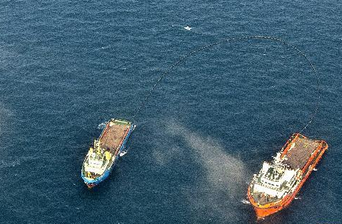 飞机沿着C平台上空盘旋,记者看到,五艘红色和蓝色的消油船围绕在C平台周围,船边的吸油拖缆和吸油毡正在不停地进行消油工作。