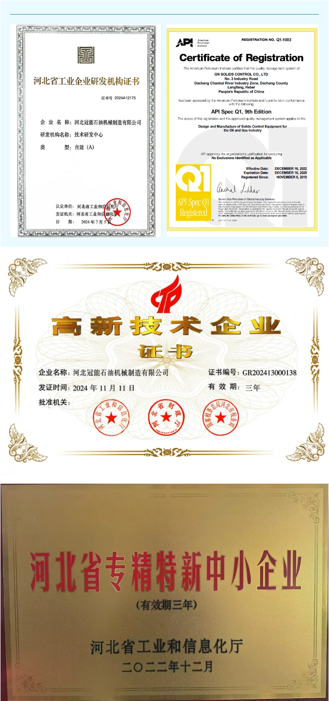 公司专注于钻井泥浆固控设备和钻井废浆处理设备的创新与研发,致力于为客户提供优良的产品,公司在国际市场的产品销售取得了优异的成绩,市场份额较国内同行有较大的优势,并形成了良好的口碑。冠能固控是国内较早成功研制出钻屑甩干机,并成功出口国际市场的中国制造商。冠能固控目前已通过欧盟CE认证、环境安全 HSE 认证、俄罗斯 TRCU 认证,也是国内连续通过美国石油协会 API认证次数较多的固控设备制造商。