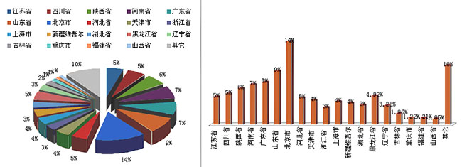 | 江苏省 5%、四川省 5%、陕西省 6%、河南省 7%、广东省 7%、山东省 9%、北京市 14%、 河北省 5%、天津市 4%、浙江省 3%、上海市 4%、新疆维吾尔 4%、湖北省 3%、黑龙江省 5%、 辽宁省 3%、吉林省 2%、重庆市 1%、福建省 1%、山西省 1%、其它 11% |